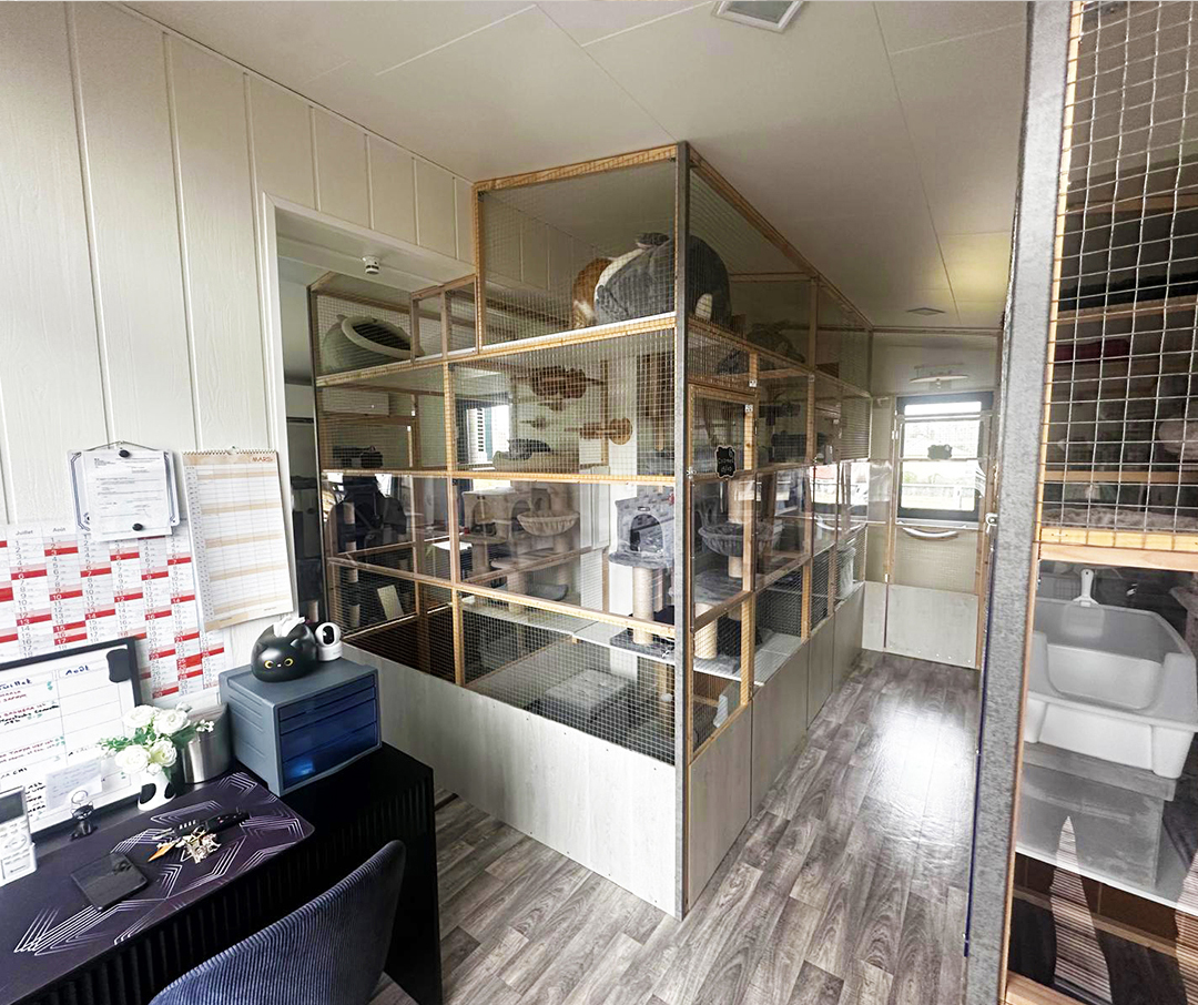 Ce projet a été réalisé en collaboration avec une professionnelle du gardiennage félin, pour garantir un lieu apaisant et fonctionnel, adapté aux besoins spécifiques de chaque chat.
